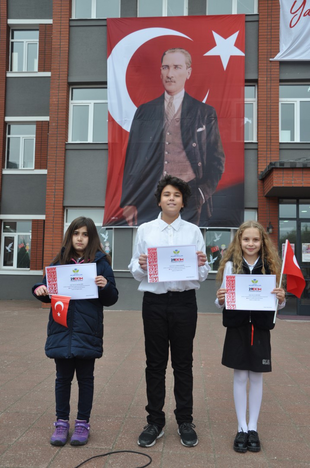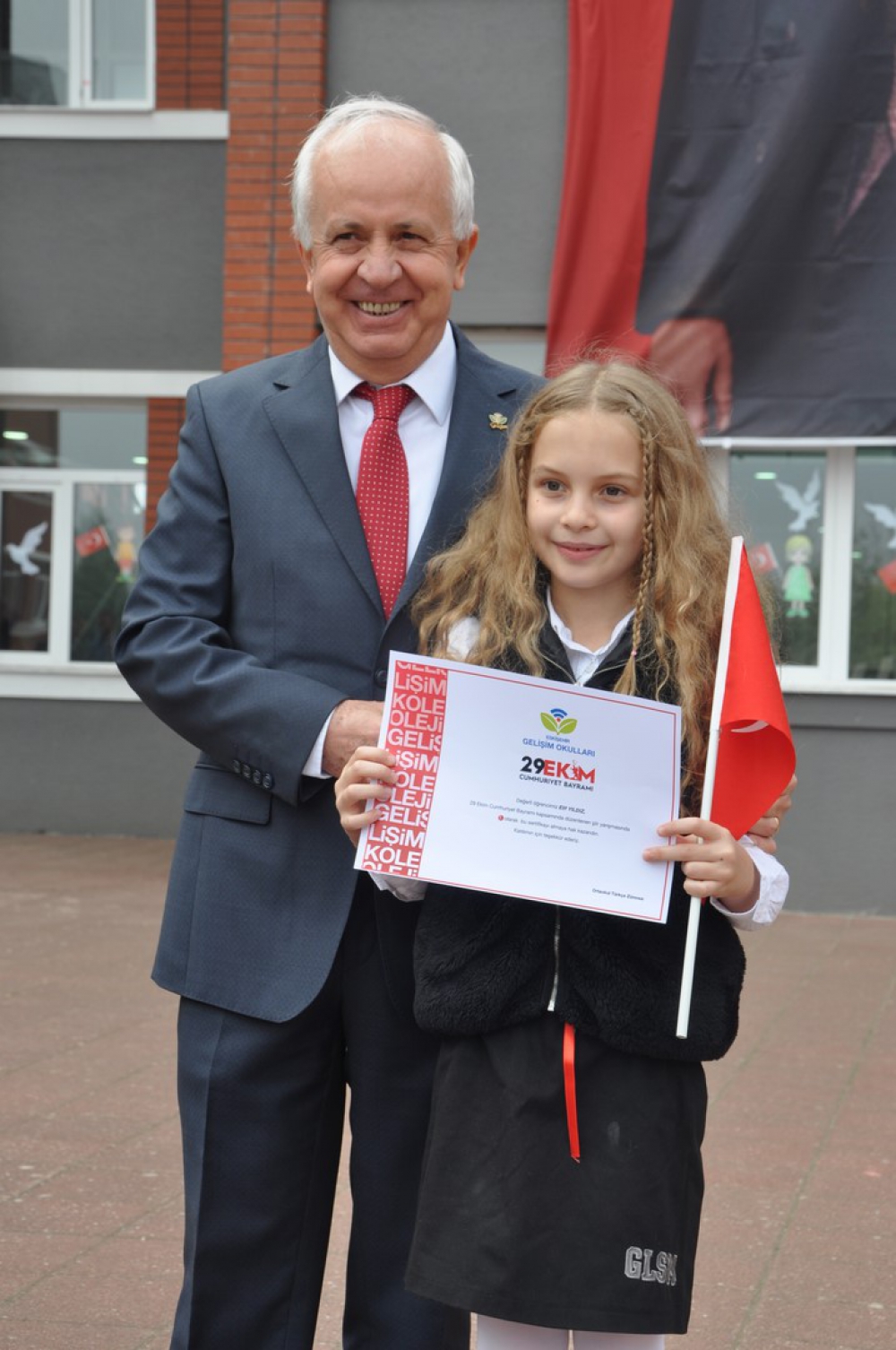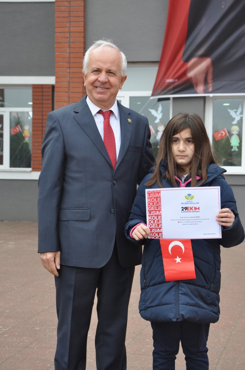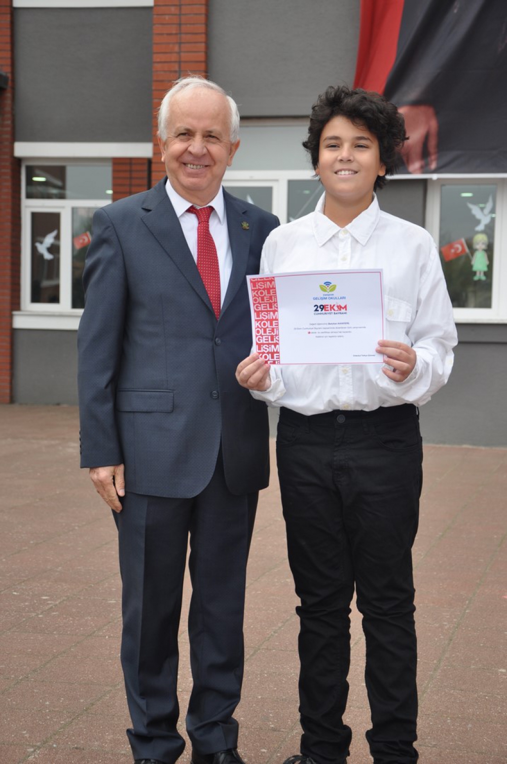 Türkçe öğretmenlerimizin düzenlediği “Cumhuriyet Konulu Hikaye ve Şiir Yarışması”ında ve Beden Eğitimi öğretmenlerimizin düzenlediği atletizm yarışmasında dereceye giren öğrencilerimize ödülleri verildi. Gelişim Senfoni Orkestrası ve 5. sınıf öğrencilerimizden oluşan koronun seslendirdiği coşkulu marşlara tüm öğrencilerimiz ve velilerimiz bayraklarla, alkışlarla eşlik etti.