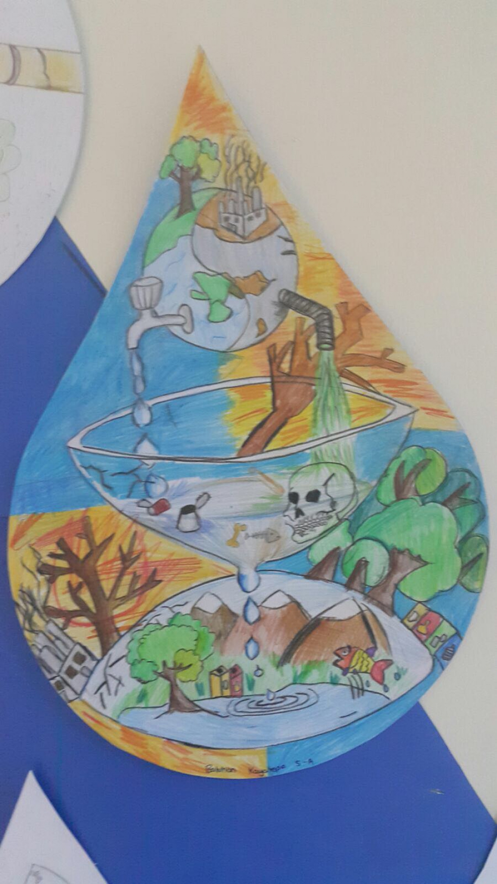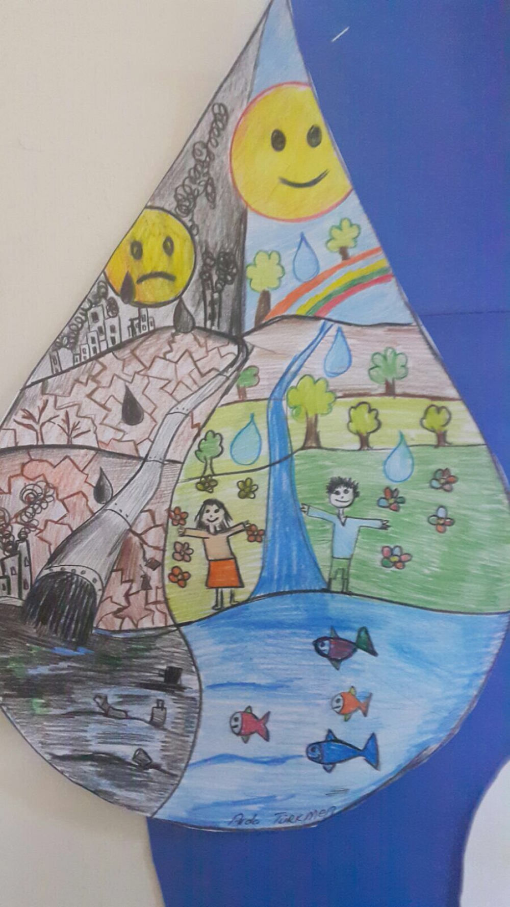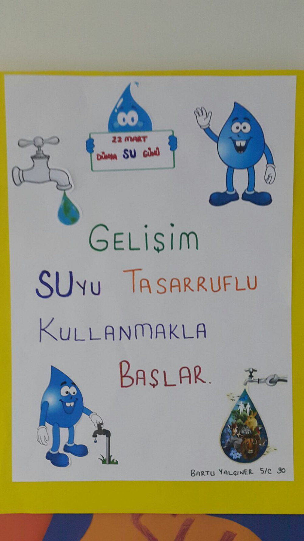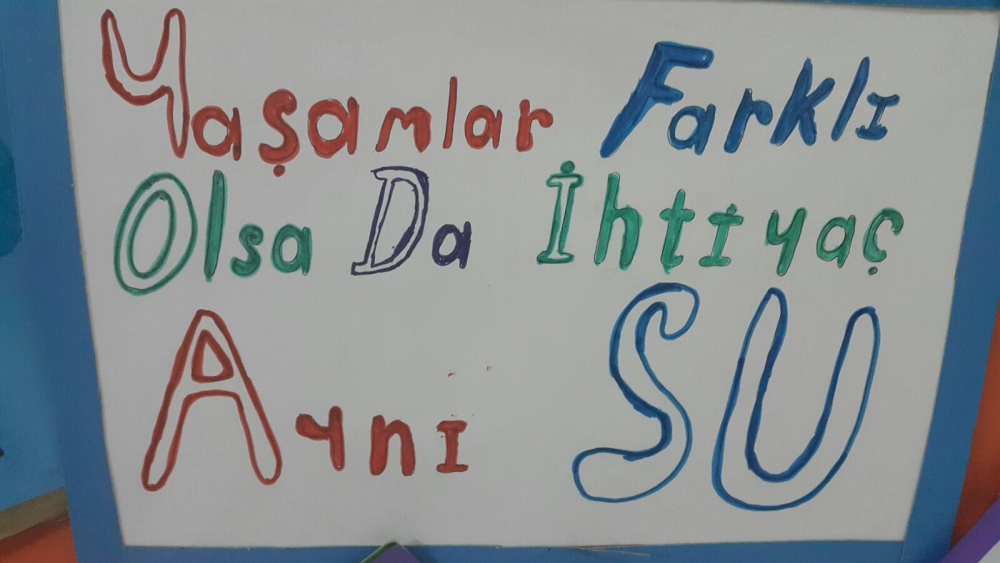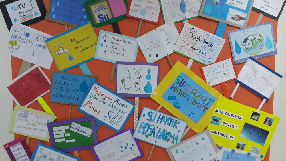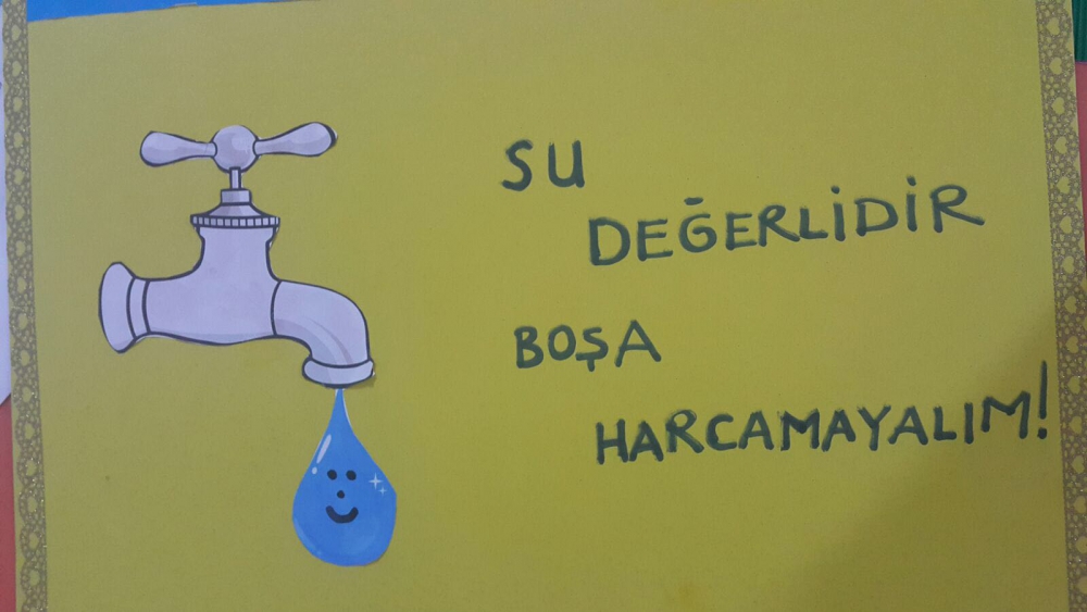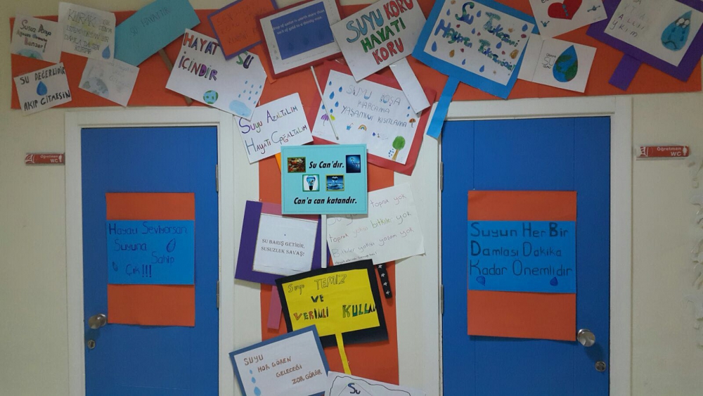 Farkındalıkları artan öğrencilerimiz suyun önemini vurgulayan sloganlar yazarak afiş hazırladılar. Hazırlamış oldukları afişleri okulun koridorlarına astılar. Okulun tuvaletlerine de afiş asarak su tasarrufunun önemini belirttiler.