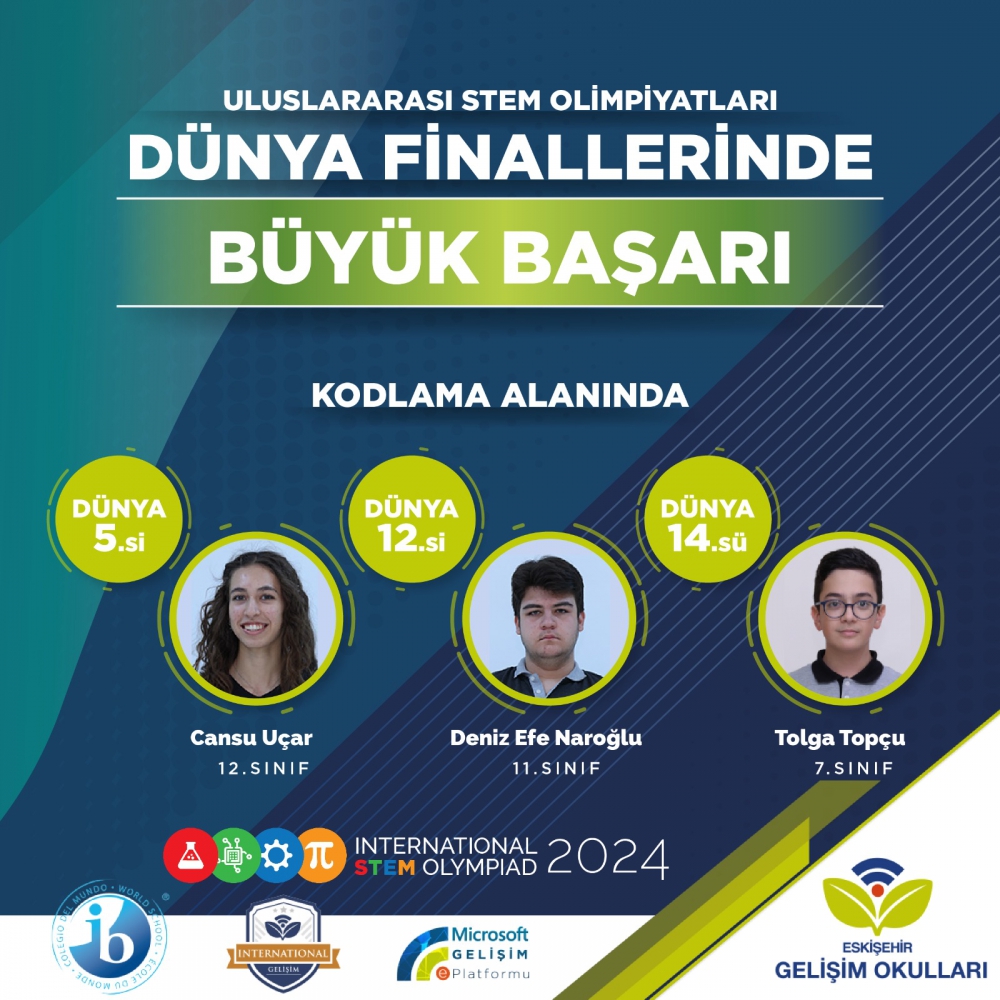 Kodlama alanında 12.sınıf öğrencimiz Cansu UÇAR dünya 5.si, 11.sınıf öğrencimiz Deniz Efe NAROĞLU dünya 12.si, 7.sınıf öğrencimiz Tolga TOPÇU dünya 14.sü